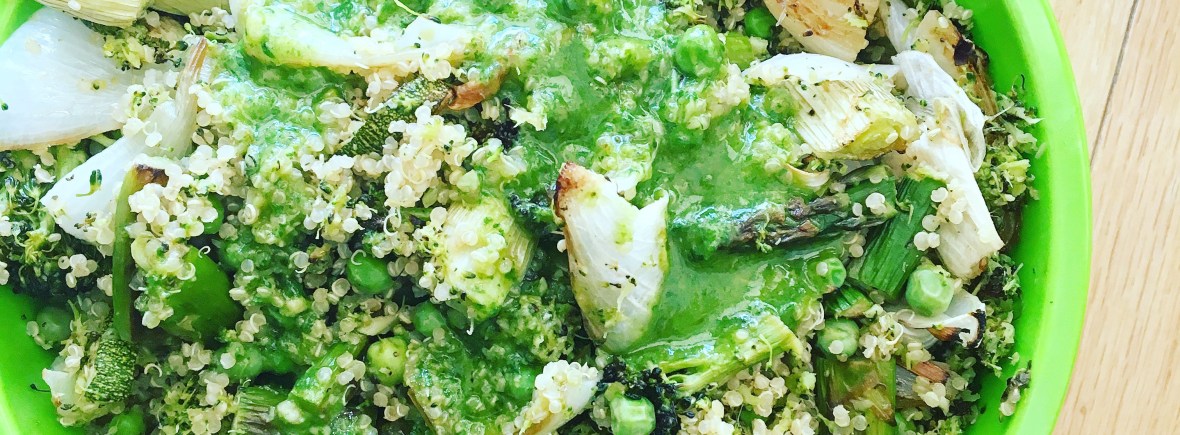 I present to you the perfect dish for spring. This Green Goddess Quinoa Salad will have your tastebuds singing – all the fresh spring veggies (English peas, spring onions, asparagus, riced broccoli, and zucchini ) and savory quinoa tossed with a tangy, refreshing lemon basil dressing.
