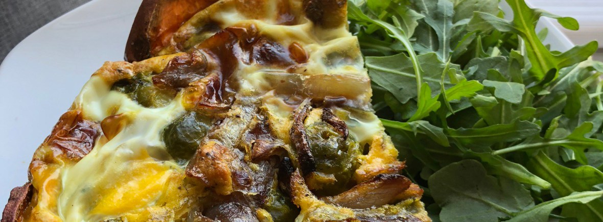 7. Once brussels sprouts and onions are ready, place them on top of the sweet potato crust, then layer on the eggs.